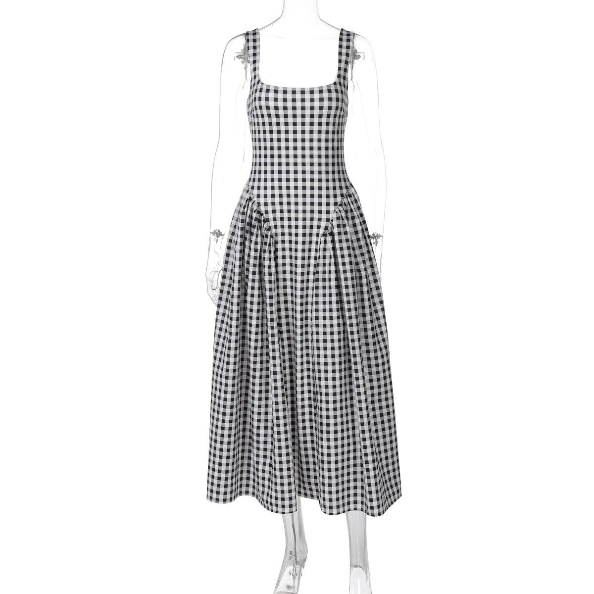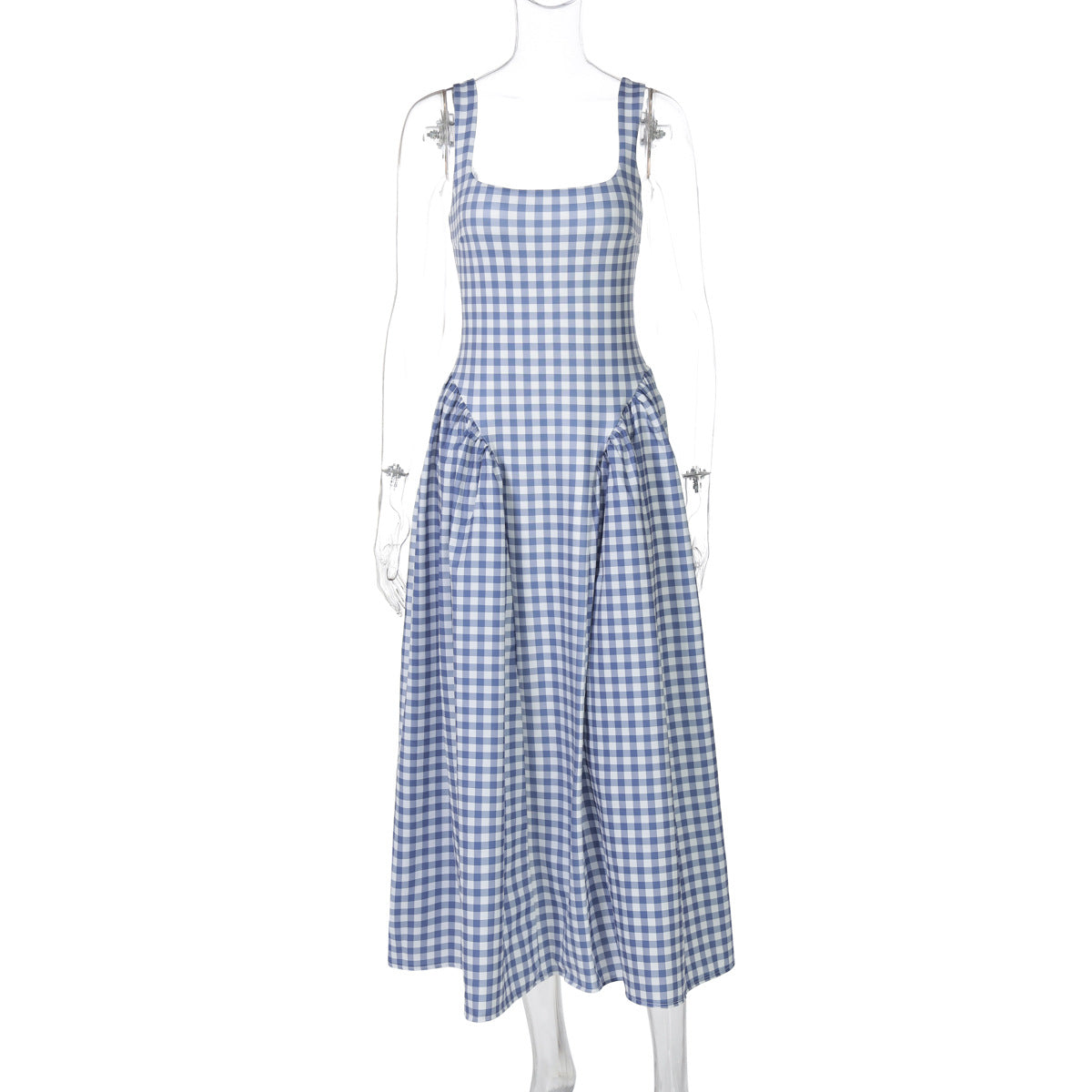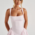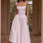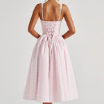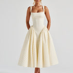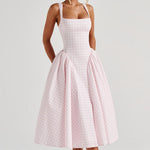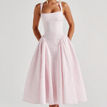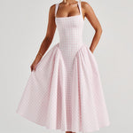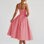 Carlena | Letnia sukienka midi w kratę podkreślająca talię i dopasowująca się do sylwetki